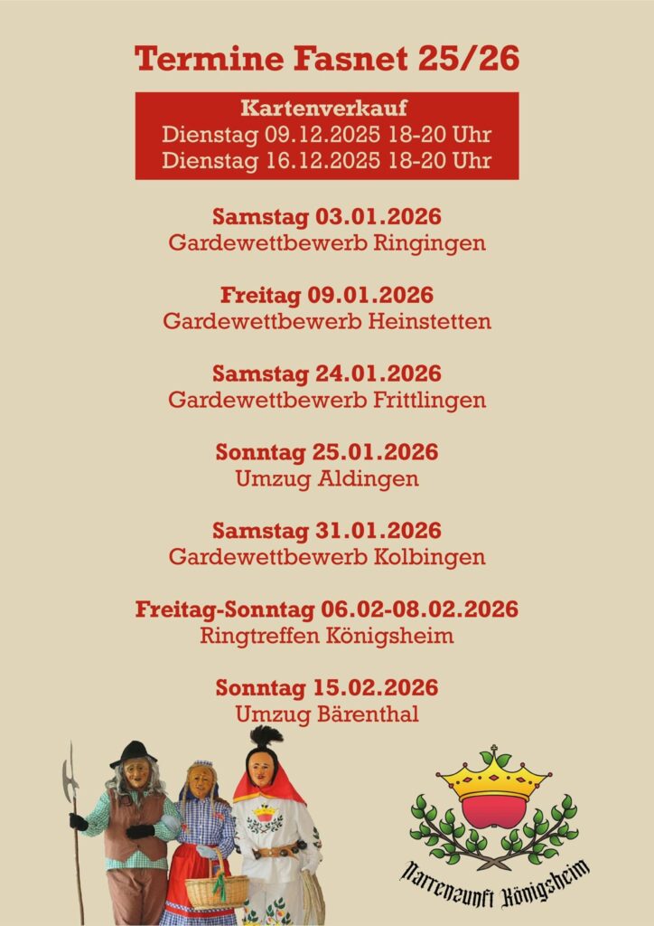 Der Narrenfahrplan 2026 steht – und wir freuen uns riesig darauf! Wir hoffen, dass viele von euch mit dabei sind und uns auf allen Veranstaltungen begleiten. Gemeinsam wollen wir den Narrenverein Königsheim lautstark und närrisch präsentieren.